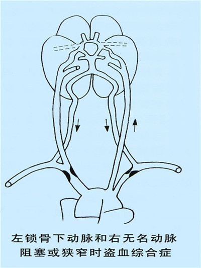 當鎖骨下動脈或無名動脈的起始部發生部分或完全阻塞時,由于上肢用力或運動時,會發生血流的轉移或再分配,即患側椎動脈的血流減少或產生反向流動,而進入患側鎖骨下動脈的遠離阻塞部,從而產生了椎-基底動脈供血不足和患側上肢的缺血,稱之為鎖骨下動脈盜血綜合征。
