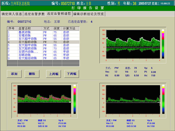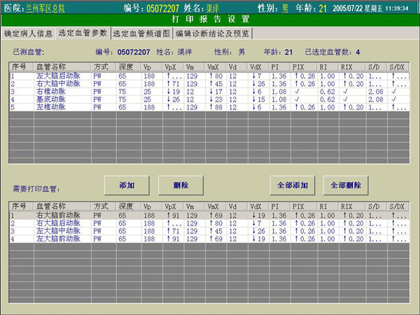 使用超聲經(jīng)顱多普勒檢測時,需要查看受檢者的血管參數(shù)和血流頻譜圖。在超聲經(jīng)顱多普勒血流分析儀選擇血管參數(shù)時,界面列表中將自動顯示與正常值的偏差值,讓醫(yī)生一目了然地掌握該病人的參數(shù)異常情況,節(jié)約了分析時間。在選擇頻譜圖時醫(yī)生可根據(jù)已檢測的血管頻譜圖像進(jìn)行選擇,是否添加到超聲經(jīng)顱多普勒血流分析儀報告中。