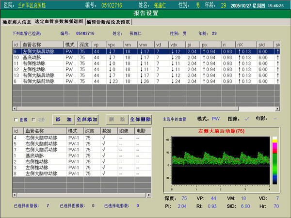 在“選定血管參數(shù)及頻譜圖”界面中,超聲經(jīng)顱多普勒血流分析儀選擇血管參數(shù)的同時選擇血管頻譜圖,還增加了“電影”選擇按鈕(選擇動態(tài)數(shù)據(jù)保存),方便醫(yī)生以后查看超聲經(jīng)顱多普勒血流分析儀報告時對頻譜圖進(jìn)行電影回放,再作分析。